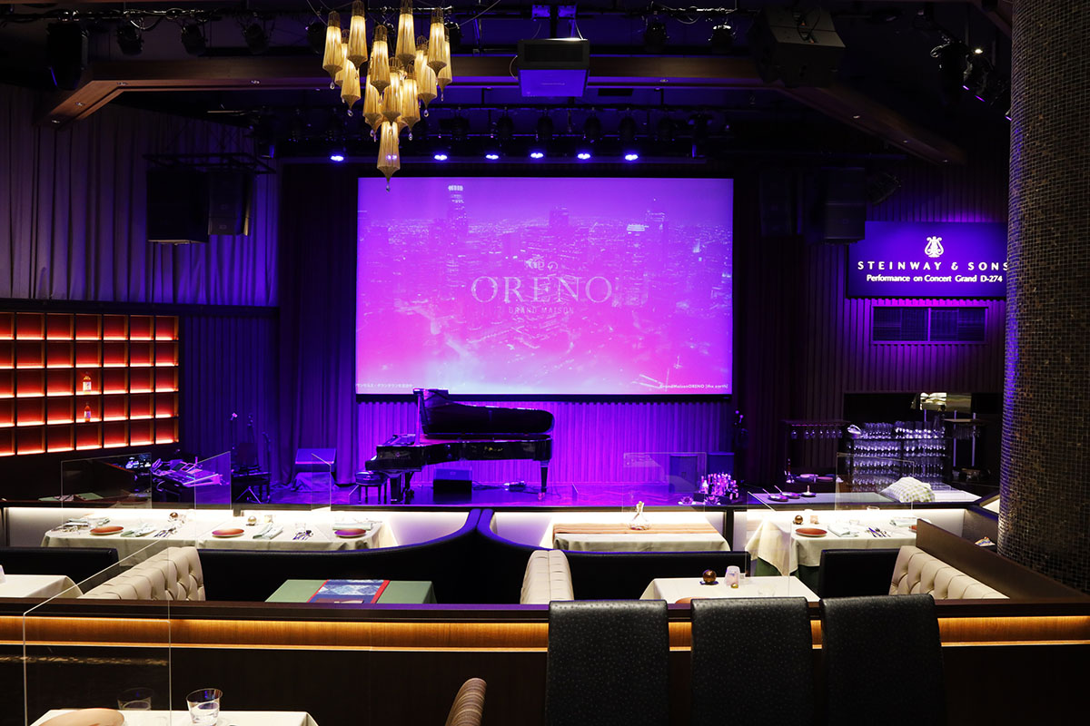 天井高7m、300インチプロジェクター付きのステージを備えた豪華な空間に、俺のフレンチのお料理もご用意!貸切イベントの会場として、ぜひご検討くださいませ。